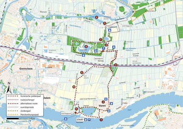 Voor je op pad gaat, is het bij Fort Vuren eerst genieten van het dynamische rivierenlandschap met het zicht op Slot Loevestein aan de overkant van de Waal. Langs de verdedigingslijn van de Nieuwe Hollandse Waterlinie gaat het noordwaarts over de herstelde kade en langs een waterrijk natuurgebiedje, om even later de A15 en de Betuwelijn te kruisen. In het kommenlandschap dat voor je ligt, is in de jaren zestig het Lingebos aangelegd als recreatiegebied voor de Randstad. Je kunt een extra lusje maken naar de Linge of de route blijven volgen die terugvoert naar het dorp Vuren en het struinpad langs de Waal.