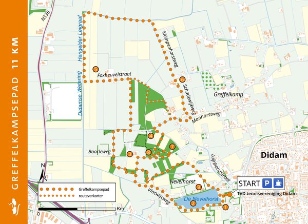 Langs het Greffelkampsepad herinneren namen van boerderijen, opgetrokken uit materialen van afgebroken havenzaten, aan de geschiedenis van deze versterkte boerderijen. In de Greffelkamp waren er ooit maar liefst zeven. De eigenaar had zeggenschap over water en wind, het recht op houtkap en jacht en mocht varkens in een stuk bos ‘op de mast’ drijven als daar eikels waren gevallen. Op de grens tussen zandgronden en komkleigebied voert dit Klompenpad langs een zandafgraving, door rabattenbossen en over een lang pad langs de Didamse Wetering die voor de afwatering van het broekgebied zorgt. Veel landschappelijke variatie met de mogelijkheid van een routeverkorter.