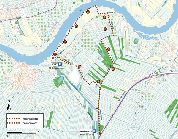 Dit gebied in de gemeente Vijfheerenlanden was ooit rijk aan molens, die er droogmaalden. Het gebied is nu rijk aan zeldzame planten omdat Stichting Zuid-Hollands Landschap de polder op meerdere plekken heeft afgegraven en schrale en zanderige ondergrond aan de oppervlakte komt. Soorten als grote tijm en kleine pimpernel vind je hier. De grond is in de winter voor vogels ideaal om in te purren. Ook is het gebied rijk aan vogels; in polder Achthoven leven vele kieviten en bijna honderd wulpen. Het is belangrijk dat er in de winter rust heerst in deze polder en daarom is de route dan gesloten.