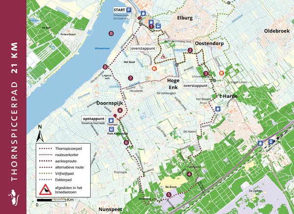 Dit langere pad voert door het veenontginningslandschap tussen Elburg en Nunspeet, de overgang van Veluwse stuwwal, met bos, heide en zandverstuivingen, naar het lager gelegen weidegebied. Vanuit de Elburgse vesting slingert de route door nattere broeklanden en over landgoed Huis Schouwenburg richting ’t Harde, om daarna af te buigen naar het stuifzandgebied De Haere. Over de Doornspijkerheide en langs oude jeneverbessen draait het pad in noordelijke richting. Vlak voor het dorp Doornspijk passeer je landgoed Klarenbeek. Het laatste deel van het traject gaat door het oorspronkelijk gemeenschappelijke weidegebied Het Goor, dat door de eeuwen heen regelmatig overspoeld raakte door Zuiderzeewater.